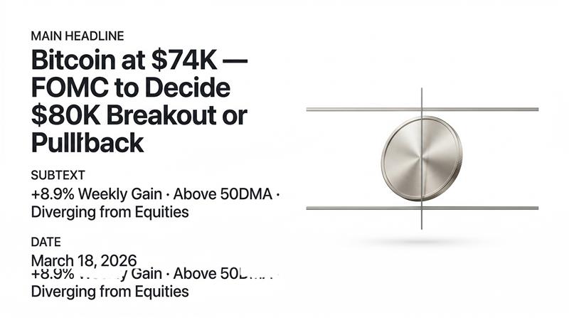 Bitcoin has recovered +8.96% over the past week to trade at $74,000, marking its first daily close above the April 2025 bottom in 6 weeks and three consecutive closes above the 50-day SMA. Today’s single dominant catalyst is the FOMC rate decision at 14:00 ET (19:30 IST). Markets price a 92%+ probability of a hold at 3.50–3.75%, but the dot plot and Powell’s press conference tone will determine whether BTC breaks toward $78,000–$80,000 or reverses toward $68,000–$70,000. Critically, BTC has decoupled positively from equities over the past week — the S&P 500 fell 0.61% on the same day crypto markets added $120 billion in market cap, a rare divergence suggesting institutional rotation into BTC as a geopolitical hedge alongside gold. That divergence is the bullish case. The historical track record is the bear case: Bitcoin fell after 7 of 8 FOMC meetings in 2025.