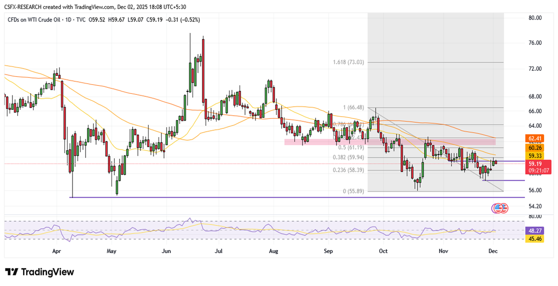 West Texas Intermediate (WTI) traded near $59.25 during North American hours, slipping modestly as renewed US Dollar strength dampened demand for dollar-denominated commodities. Traders now await the API crude stockpiles report, which could inject fresh volatility into the market.