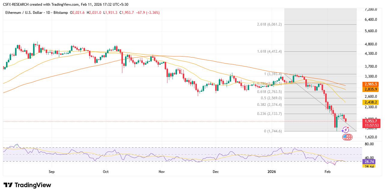 Ethereum failed at the 78.6% Fibonacci retracement near $2,149, confirming strong overhead resistance. Momentum remains weak, and RSI below 30 signals heavy selling pressure. A break below $1,987 could accelerate losses toward $1,750. Bulls need a decisive daily close above $2,150 to regain control.