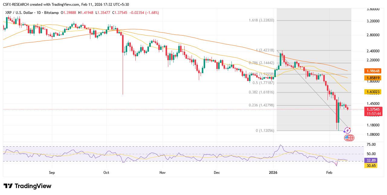 XRP remains capped below the broken wedge structure, with consistent rejection near resistance. Technical alignment across moving averages favors sellers. Sustained weakness below $1.40 keeps downside risk open toward $1.30. A breakout above $1.79 would be required to meaningfully shift sentiment.