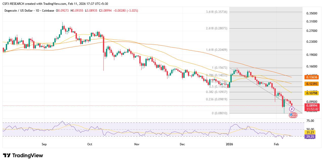 Dogecoin continues its multi-week downtrend, trading below both 50-day and 200-day EMAs. RSI and MACD confirm strengthening bearish momentum. A break below $0.086–$0.080 support could trigger another leg lower. Recovery attempts will likely face selling pressure near $0.098 and $0.115.