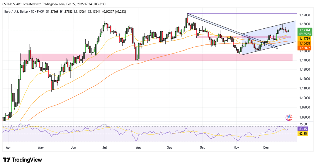 EUR/USD is trading slightly higher, holding above the 1.1700 level during early European hours as the euro draws support from the European Central Bank’s latest policy stance. The pair remains steady as traders digest central bank signals and scale back activity ahead of the holiday period.