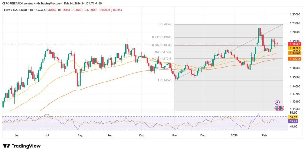 EUR/USD stabilized after testing key short-term support, with price action hovering near the 1.1850–1.1900 zone. The pair continues to respond primarily to US macro developments rather than euro area fundamentals.
